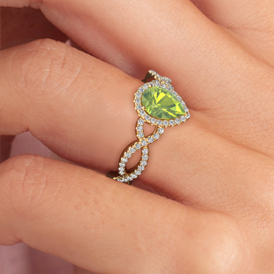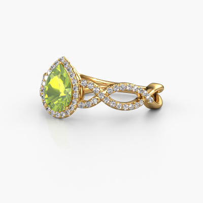This 14 Carat gold ring is called Dionne pear and is set with 7x5 mm peridot. Does your girlfriend fancy exclusive jewelry? Or would you like to show her that she deserves the finest jewelry? This gold ring is pure craftsmanship, love and passion combined with the latest techniques coming together in perfect harmony. It requires a keen eye, patience and a skillful hand to mold this ring into perfection. Just the job for our expert goldsmith! The peridot set gemstones gives this gold ring an extra glamorous appearance. Customize the style of the twist engagement ring to her liking with a wide variety of precious metals and gemstones which you select. That is how you create a unique ring for the most exclusive woman in your life! This jewel is created to add sparkle to your finger, each jewel is lovingly made by hand by our goldsmiths.Are you on a budget? Please feel free to contact us, so we can go discuss your options. We offer our engagement rings at guaranteed best price, because we make them to order. You won't find such a price anywhere else!Different styles of new rings are made daily by our team. Perhaps you have found a pavé solitaire engagement ring somewhere. One you would like to give to your loved one. Please feel free to share your thoughts and design with our jewel designers. We would love to turn your design into a exclusive engagement ring. You can follow the development of your ring design because we use very detailed 3D drawings. On top of that, you can order a dummy of the design. A dummy is a plastic ring, which can be shaped according your ring design. You can try it on and check if the engagement ring is up to standard. We will gladly send you a non-binding offer, based on a fair price/ quality ratio. The offer will baffle you, considering the quality of the ring and gemstones.To make it easier for you, we offer a 30 day return policy. Check our terms and conditions.