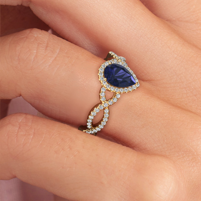 This 14 Carat gold ring is called Dionne pear and is set with 7x5 mm sapphire. Does your girlfriend fancy exclusive jewelry? Or would you like to show her that she deserves the finest jewelry? This gold ring is pure craftsmanship, love and passion combined with the latest techniques coming together in perfect harmony. It requires a keen eye, patience and a skillful hand to mold this ring into perfection. Just the job for our expert goldsmith! The sapphire set gemstones gives this gold ring an extra glamorous appearance. Customize the style of the twist engagement ring to her liking with a wide variety of precious metals and gemstones which you select. That is how you create a unique ring for the most exclusive woman in your life! This jewel is created to add sparkle to your finger, each jewel is lovingly made by hand by our goldsmiths.Are you on a budget? Please feel free to contact us, so we can go discuss your options. We offer our engagement rings at guaranteed best price, because we make them to order. You won't find such a price anywhere else!Different styles of new rings are made daily by our team. Perhaps you have found a pavé solitaire engagement ring somewhere. One you would like to give to your loved one. Please feel free to share your thoughts and design with our jewel designers. We would love to turn your design into a exclusive engagement ring. You can follow the development of your ring design because we use very detailed 3D drawings. On top of that, you can order a dummy of the design. A dummy is a plastic ring, which can be shaped according your ring design. You can try it on and check if the engagement ring is up to standard. We will gladly send you a non-binding offer, based on a fair price/ quality ratio. The offer will baffle you, considering the quality of the ring and gemstones.To make it easier for you, we offer a 30 day return policy. Check our terms and conditions.