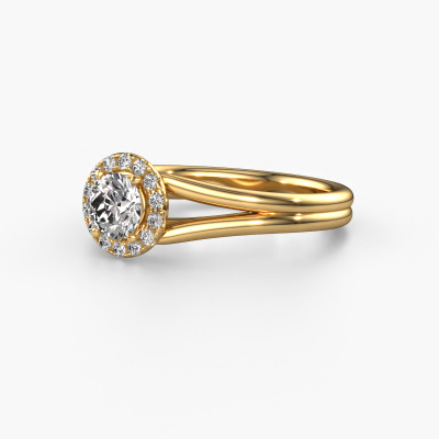 The ring shown above is called the Verla rnd 1. We call this type of ring a halo ring because it has one center gemstone and a band that is also pave set with gemstones. The 14 Carat gold engagement ring is set with a round 0.50 crt diamond center stone and the band is pave set with diamonds. What makes this classic gold halo ring special are the smaller sized stones embracing the center stone. This gorgeous engagement ring is called a halo ring because the smaller gemstones give the center stone a halo of surrounding light. In order for the smaller stones to enhance the center stone, they have to be placed so there is no interference of light. And that's when our expert goldsmiths come in. Each individual stone is carefully set in the ring by hand. During manufacturing, light fall is constantly monitored to make sure the special halo is still visible. In the end you get a unique engagement ring, with a diamond of your choosing at its centre. You can imagine the effect of a ring of such significance when you give it to her on her special day to shine. By using a combination of the latest modern techniques, combined with ancient crafting, we can make all our engagement rings in our own studio. Each jewel is made to order. This is advantageous because we can offer you a price you won't find anywhere else.Our team adds new designs to our online collection daily. Our designers and goldsmiths work together in creating the best design. We strive to offer a diverse collection of jewels. Perhaps you have a specific jewel design in mind. One you came across somewhere. Please contact us for a free consultation. We will make you an offer, based on a fair price/ quality ratio, that will baffle you.To make it easier for you, we offer a 30 day return policy. Check our terms and conditions.