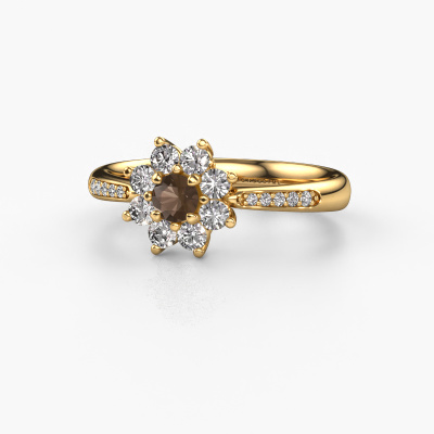 The ring shown above is called the Camille 2. We call this type of ring a cluster ring, the center gemstone is surrounded by smaller sized stones. This 14 Carat gold version is set with a 3.4 mm round smokey quartz center stone, embraced by smaller diamonds. If you look at this gold cluster engagement ring, you might get the impression that its smaller sized stones collide with the bigger smokey quartz, so it is shaped like a flower. Therefore this engagement ring is also known as the flower ring. Our artisan goldsmiths get the job done. Each individual stone is carefully set by hand. During manufacturing, light fall is constantly monitored to make sure the special cluster effect is still visible. In the end you get the perfect engagement ring with a radiant smokey quartz gemstone centerpiece. You can imagine the effect of a ring of such significance when you give tot the love of your life on her special day to shine. Because we design and deliver our own rings, we can offer you a engagement ring at a price you won't find anywhere else. A ring is made to order, which helps prevent excess supplies, so we can make you a great price offer. We understand it feels risky, buying your engagement ring online, but we will gladly assist in the designing process, taking your budget into consideration.Our team adds new designs to our online collection daily. Our designers and goldsmiths work together in creating the best design. We strive to offer a diverse collection of jewels. Perhaps you have a specific jewel design in mind. One you came across somewhere. Please contact us for a free consultation. We will make you an offer, based on a fair price/ quality ratio, that will baffle you.To make it easier for you, we offer a 30 day return policy. Check our terms and conditions.
