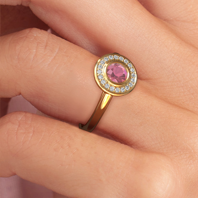The ring shown above is called the Noud 1 RND. We call this type of ring a halo ring because it has one center gemstone and a band that is also pave set with gemstones. The 14 Carat gold promise ring is set with a round 4.7 mm tourmaline pink center stone and the band is pave set with diamonds. What makes this traditional gold halo ring special are the smaller sized stones embracing the center stone. This gorgeous promise ring is called a halo ring because the smaller gemstones give the center stone a halo of surrounding light. In order for the smaller stones to enhance the center stone, they have to be placed so there is no interference of light. And that's when our expert goldsmiths come in. Each individual stone is carefully set in the ring by hand. During manufacturing, light fall is constantly monitored to make sure the special halo is still visible. In the end you get a unique promise ring, with a tourmaline pink of your choosing at its centre. You can imagine the effect of a ring of such significance when you give it to her on her special day to shine. By using a combination of the latest modern techniques, combined with ancient crafting, we can make all our promise ring in our own studio. Each jewel is made to order. This is advantageous because we can offer you a price you won't find anywhere else.Do you have a specific ring in mind? One you came across somewhere. Please feel free to tell us your wishes and we will turn your design into a unique promise ring. You can follow the development of your ring design because we use 3D drawings. This gives you a realistic preview of your design. We will gladly send you a non-binding offer, based on a fair price/ quality ratio. It will amaze you.To make it easier for you, we offer a 30 day return policy. Check our terms and conditions.