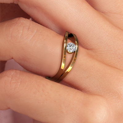 This 14 Carat gold ring is called Sigrid 1 and is set with 3.7 mm zirconia. This design gold engagement ring is a true masterpiece! Our expert goldsmith uses special techniques during crafting of this tension set ring to make sure the zirconia of this gold ring is fixed properly. The effect is that light fall reflects beautifully on the gemstone, which gives the ring its maximum shine and glamorous appearance. The result is a unique ring, with a trendy appearance, passionately handcrafted to perfection by our artisan goldsmith. A one-of-a-kind ring, designed for the love of your life! This jewel is made to shine bright around your finger. Each jewel is hand made with love by our goldsmiths.By using our modern techniques, we can design and customize the finest quality jewels with the utmost care for you. Our engagement rings are always priced 30 percent lower than other jewelers. We make engagement rings to order so we don't have to maintain a large stock. If you have a certain budget, we are more than happy to advice you accordingly.Different styles of new rings are made daily by our team. Perhaps you have found a solitaire engagement ring somewhere. One you would like to give to your loved one. Please feel free to share your thoughts and design with our jewel designers. We would love to turn your design into a design engagement ring. You can follow the development of your ring design because we use very detailed 3D drawings. On top of that, you can order a dummy of the design. A dummy is a plastic ring, which can be shaped according your ring design. You can try it on and check if the engagement ring is up to standard. We will gladly send you a non-binding offer, based on a fair price/ quality ratio. The offer will baffle you, considering the quality of the ring and gemstones.To make it easier for you, we offer a 30 day return policy. Check our terms and conditions.