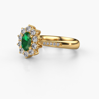 The ring shown above is called the Leesa 2. We call this type of ring a cluster ring, the center gemstone is surrounded by smaller sized stones. This 14 Carat gold version is set with a 6x4 mm oval emerald center stone, embraced by smaller diamonds. The classic gold cluster engagement ring stands out because of its shape. Together, the smaller and bigger sized emerald gemstones form a flower and they appear to collide into one big sparkling gem. This classic engagement ring is also known as the flower ring. Our expert Goldsmiths make sure the smaller diamonds stones are set identically so there is no light interference in the emerald but unity instead. With perfect precision and a skillful hand each emerald is set in the ring. During manufacturing, it is constantly monitored to make sure light reflects flawlessly. This results in a unique engagement ring, with a radiant emerald at its centre. A lovely, meaningful gift to bestow upon the love of your life. Are you on a budget? Please feel free to contact us, so we can go discuss your options. We offer our engagement rings at guaranteed best price, because we make them to order. You won't find such a price anywhere else!Our designers and goldsmiths work together each day, creating new jewels. Perhaps you have found a nice classic engagement ring somewhere, which can be used to customize your unique ring. Please feel free to contact us. We will make you an offer, based on a fair price/ quality ratio, which will amaze you.To make it easier for you, we offer a 30 day return policy. Check our terms and conditions.