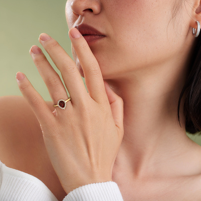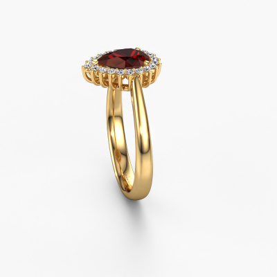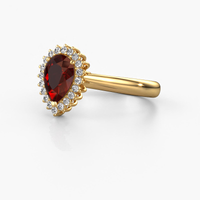 The ring shown above is called the Tilly per 1. We call this type of ring a cluster ring, the center gemstone is surrounded by smaller sized stones. This 14 Carat gold version is set with a 8x6 mm pear garnet center stone, embraced by smaller diamonds. The exclusive gold cluster engagement ring stands out because of its shape. Together, the smaller and bigger sized garnet gemstones form a flower and they appear to collide into one big sparkling gem. This exclusive engagement ring is also known as the flower ring. Our expert Goldsmiths make sure the smaller diamonds stones are set identically so there is no light interference in the garnet but unity instead. With perfect precision and a skillful hand each garnet is set in the ring. During manufacturing, it is constantly monitored to make sure light reflects flawlessly. This results in a unique engagement ring, with a radiant garnet at its centre. A lovely, meaningful gift to bestow upon the love of your life. After receiving your order, our goldsmiths will start the creative process of making your Tilly per 1 engagement ring. We don't keep stock. This is advantageous because these costs will not be passed on to you. Therefore, we can offer jewelry at exceptionally low prices.Our team adds new designs to our online collection daily. Our designers and goldsmiths work together in creating the best design. We strive to offer a diverse collection of jewels. Perhaps you have a specific jewel design in mind. One you came across somewhere. Please contact us for a free consultation. We will make you an offer, based on a fair price/ quality ratio, that will baffle you.To make it easier for you, we offer a 30 day return policy. Check our terms and conditions.