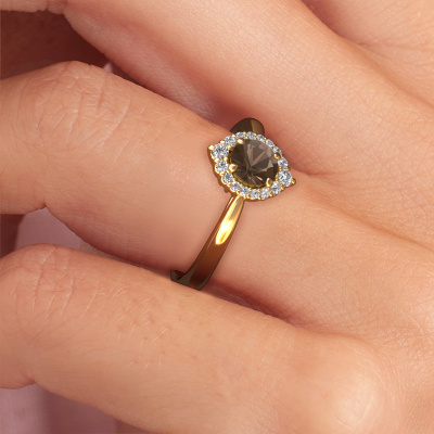 The ring shown above is called the Tora. We call this type of ring a cluster ring, the center gemstone is surrounded by smaller sized stones. This 14 Carat gold version is set with a 5 mm round smokey quartz center stone, embraced by smaller lab grown diamonds. The classic gold cluster engagement ring stands out because of its shape. Together, the smaller and bigger sized smokey quartz gemstones form a flower and they appear to collide into one big sparkling gem. This classic engagement ring is also known as the flower ring. Our expert Goldsmiths make sure the smaller lab grown diamonds stones are set identically so there is no light interference in the smokey quartz but unity instead. With perfect precision and a skillful hand each smokey quartz is set in the ring. During manufacturing, it is constantly monitored to make sure light reflects flawlessly. This results in a unique engagement ring, with a radiant smokey quartz at its centre. A lovely, meaningful gift to bestow upon the love of your life. By using a combination of the latest modern techniques, combined with ancient crafting, we can make all our engagement rings in our own studio. Each jewel is made to order. This is advantageous because we can offer you a price you won't find anywhere else.Have you found a specific engagement ring somewhere which you would like to give to your loved one? Please feel free to express your wishes to our jewel designers because we would be honored to turn your design into a classic engagement ring. You can follow the development of your ring design because we use 3D drawings. This gives you a realistic preview of how your design will look. You can also preorder a dummy. A dummy is a plastic ring, which can be shaped according your ring design. You can try it on and check if its width and size are suitable for you. We will gladly send you a non-binding offer, based on a fair price/ quality ratio. It will amaze you, considering the quality of the ring and gemstones.To make it easier for you, we offer a 30 day return policy. Check our terms and conditions.