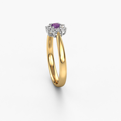 The ring shown above is called the Carolyn 1. We call this type of ring a cluster ring, the center gemstone is surrounded by smaller sized stones. This 14 Carat gold version is set with a 3 mm round amethyst center stone, embraced by smaller diamonds. The traditional gold cluster engagement ring stands out because of its shape. Together, the smaller and bigger sized amethyst gemstones form a flower and they appear to collide into one big sparkling gem. This traditional engagement ring is also known as the flower ring. Our expert Goldsmiths make sure the smaller diamonds stones are set identically so there is no light interference in the amethyst but unity instead. With perfect precision and a skillful hand each amethyst is set in the ring. During manufacturing, it is constantly monitored to make sure light reflects flawlessly. This results in a unique engagement ring, with a radiant amethyst at its centre. A lovely, meaningful gift to bestow upon the love of your life. By using our modern techniques, we can design and customize the finest quality jewels with the utmost care for you. Our engagement rings are always priced 30 percent lower than other jewelers. We make engagement rings to order so we don't have to maintain a large stock. If you have a certain budget, we are more than happy to advice you accordingly.Do you have a specific ring in mind? One you came across somewhere. Please feel free to tell us your wishes and we will turn your design into a unique engagement ring. You can follow the development of your ring design because we use 3D drawings. This gives you a realistic preview of your design. We will gladly send you a non-binding offer, based on a fair price/ quality ratio. It will amaze you.To make it easier for you, we offer a 30 day return policy. Check our terms and conditions.
