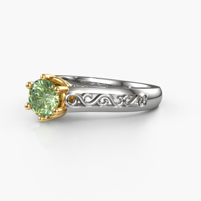The ring shown above is called the Shan, we call this a solitaire ring because it contains a single gemstone. The engagement ring is made in 14 Carat white gold and has a round green lab grown diamond of 6 mm. The cool thing about our configurator is that you can compile your own piece of jewelry, into a completely personalized one. This solitaire ring is crafted in the precious metals white gold with gold, but of course you are free to pick your own colors. Each piece of jewelry is made by a team of passionate goldsmiths and jewel designers. This will make your crown jewel truly eye-catching.The solitaire ring is a special type of engagement ring. Its open prong setting allows light to strike the gemstone from various angles. This Celtic engagement ring is a stunning eye-catcher because of the high positioning of the gemstone. In order for you to commemorate your proposal with a unique ring, we carefully adorn this solitaire ring by hand. The love of your life deserves nothing but the best. By using our modern techniques, we can design and customize the finest quality jewels with the utmost care for you. Our engagement rings are always priced 30 percent lower than other jewelers. We make engagement rings to order so we don't have to maintain a large stock. If you have a certain budget, we are more than happy to advice you accordingly.Have you found a specific engagement ring somewhere which you would like to give to your loved one? Please feel free to express your wishes to our jewel designers because we would be honored to turn your design into a Celtic engagement ring. You can follow the development of your ring design because we use 3D drawings. This gives you a realistic preview of how your design will look. You can also preorder a dummy. A dummy is a plastic ring, which can be shaped according your ring design. You can try it on and check if its width and size are suitable for you. We will gladly send you a non-binding offer, based on a fair price/ quality ratio. It will amaze you, considering the quality of the ring and gemstones.To make it easier for you, we offer a 30 day return policy. Check our terms and conditions.