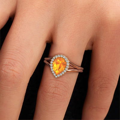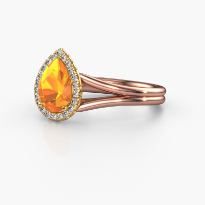 This 14 Carat rose gold ring is called Verla pear 1 and is set with 8x6 mm citrin. This exclusive rose gold halo engagement ring is a true work of art! The ornaments are crafted with a lot of patience and great passion. In order to create this ring with great precision, this craft requires a keen eye and skillful hand. A challenge which ignites a fire in our expert goldsmith. The exquisite citrin are set in a special way so they stand out even more. This gives the ring an even more glamorous appearance. The graceful engagement ring is actually unique on its own because of the gemstones which we carefully select especially for this ring. On top of that you select the precious metals which will be used to create a unique ring for the most extraordinary woman in your life! This jewel is made to shine bright around your finger. Each jewel is hand made with love by our goldsmiths.By using a combination of the latest modern techniques, combined with ancient crafting, we can make all our engagement rings in our own studio. Each jewel is made to order. This is advantageous because we can offer you a price you won't find anywhere else.Have you found a specific engagement ring somewhere which you would like to give to your loved one? Please feel free to express your wishes to our jewel designers because we would be honored to turn your design into a luxury engagement ring. You can follow the development of your ring design because we use 3D drawings. This gives you a realistic preview of how your design will look. You can also preorder a dummy. A dummy is a plastic ring, which can be shaped according your ring design. You can try it on and check if its width and size are suitable for you. We will gladly send you a non-binding offer, based on a fair price/ quality ratio. It will amaze you, considering the quality of the ring and gemstones.To make it easier for you, we offer a 30 day return policy. Check our terms and conditions.