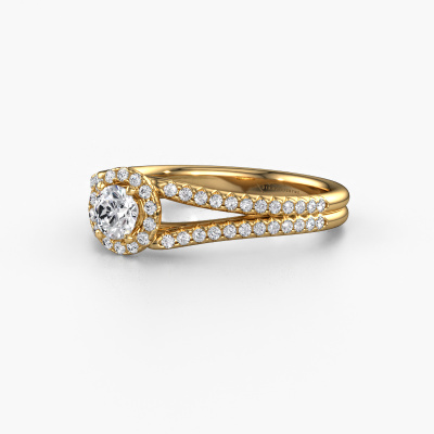 This 14 Carat gold ring is called Verla rnd 2 and is set with 0.584 crt diamond. This exclusive gold halo engagement ring is a true work of art! The ornaments are crafted with a lot of patience and great passion. In order to create this ring with great precision, this craft requires a keen eye and skillful hand. A challenge which ignites a fire in our expert goldsmith. The exquisite diamonds are set in a special way so they stand out even more. This gives the ring an even more glamorous appearance. The split band engagement ring is actually unique on its own because of the gemstones which we carefully select especially for this ring. On top of that you select the precious metals which will be used to create a unique ring for the most extraordinary woman in your life! This jewel is made just for you, with attention to detail and design.Because we design and deliver our own rings, we can offer you a engagement ring at a price you won't find anywhere else. A ring is made to order, which helps prevent excess supplies, so we can make you a great price offer. We understand it feels risky, buying your engagement ring online, but we will gladly assist in the designing process, taking your budget into consideration.Our team adds new designs to our online collection daily. Our designers and goldsmiths work together in creating the best design. We strive to offer a diverse collection of jewels. Perhaps you have a specific jewel design in mind. One you came across somewhere. Please contact us for a free consultation. We will make you an offer, based on a fair price/ quality ratio, that will baffle you.To make it easier for you, we offer a 30 day return policy. Check our terms and conditions.