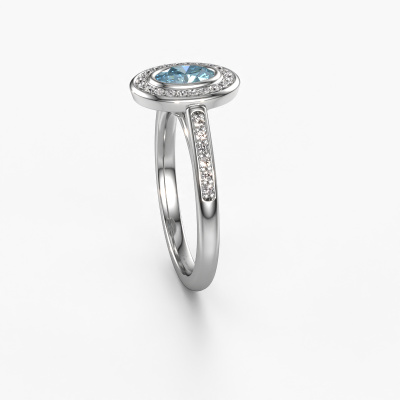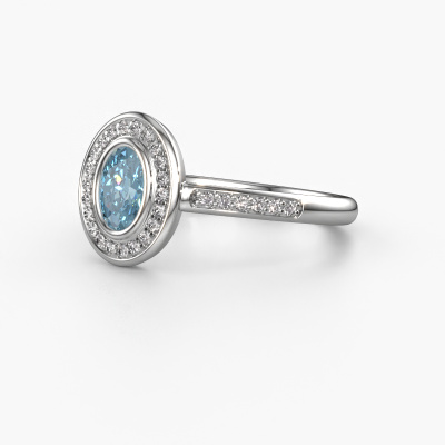 The ring shown above is called the Noud 2 OVL. We call this type of ring a halo ring because it has one center gemstone and a band that is also pave set with gemstones. The platinum engagement ring is set with a oval 6x4 mm blue lab grown diamond center stone and the band is pave set with lab grown diamonds. What makes this exclusive platinum halo ring special are the smaller sized stones embracing the center stone. This gorgeous engagement ring is called a halo ring because the smaller gemstones give the center stone a halo of surrounding light. In order for the smaller stones to enhance the center stone, they have to be placed so there is no interference of light. And that's when our expert goldsmiths come in. Each individual stone is carefully set in the ring by hand. During manufacturing, light fall is constantly monitored to make sure the special halo is still visible. In the end you get a unique engagement ring, with a blue lab grown diamond of your choosing at its centre. You can imagine the effect of a ring of such significance when you give it to her on her special day to shine. By using our modern techniques, we can design and customize the finest quality jewels with the utmost care for you. Our engagement rings are always priced 30 percent lower than other jewelers. We make engagement rings to order so we don't have to maintain a large stock. If you have a certain budget, we are more than happy to advice you accordingly.Have you found a specific engagement ring somewhere which you would like to give to your loved one? Please feel free to express your wishes to our jewel designers because we would be honored to turn your design into a exclusive engagement ring. You can follow the development of your ring design because we use 3D drawings. This gives you a realistic preview of how your design will look. You can also preorder a dummy. A dummy is a plastic ring, which can be shaped according your ring design. You can try it on and check if its width and size are suitable for you. We will gladly send you a non-binding offer, based on a fair price/ quality ratio. It will amaze you, considering the quality of the ring and gemstones.To make it easier for you, we offer a 30 day return policy. Check our terms and conditions.