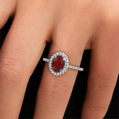 The ring shown above is called the Talitha OVL. We call this type of ring a halo ring because it has one center gemstone and a band that is also pave set with gemstones. The platinum engagement ring is set with a oval 7x5 mm ruby center stone and the band is pave set with lab grown diamonds. What makes this classic platinum halo ring special are the smaller sized stones embracing the center stone. This gorgeous engagement ring is called a halo ring because the smaller gemstones give the center stone a halo of surrounding light. In order for the smaller stones to enhance the center stone, they have to be placed so there is no interference of light. And that's when our expert goldsmiths come in. Each individual stone is carefully set in the ring by hand. During manufacturing, light fall is constantly monitored to make sure the special halo is still visible. In the end you get a unique engagement ring, with a ruby of your choosing at its centre. You can imagine the effect of a ring of such significance when you give it to her on her special day to shine. By using a combination of the latest modern techniques, combined with ancient crafting, we can make all our engagement rings in our own studio. Each jewel is made to order. This is advantageous because we can offer you a price you won't find anywhere else.Our designers and goldsmiths work together each day, creating new jewels. Perhaps you have found a nice classic engagement ring somewhere, which can be used to customize your unique ring. Please feel free to contact us. We will make you an offer, based on a fair price/ quality ratio, which will amaze you.To make it easier for you, we offer a 30 day return policy. Check our terms and conditions.