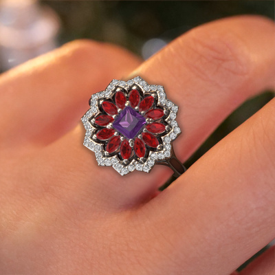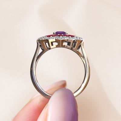 This platinum ring is called Franka and is set with 4 mm amethyst. Is your girlfriend hooked on vintage? Then this platinum daring engagement ring will surely match her style perfectly. A trendy ring with just a hint of vintage adornment. A truly stunning, romantic design! Especially when you customize your ring to your own liking. This vintage halo engagement ring is set with stunning amethysten. As you can see, you are the boss in selecting a gemstone which matches the style of your girlfriend best. Each gemstone is carefully selected by our merchants whom are spread throughout the world. Nothing but the best gems for our expert goldsmith. After all, it is his crowning glory! Each jewel is made just for you by our master goldsmiths in our own studio.By using a combination of the latest modern techniques, combined with ancient crafting, we can make all our engagement rings in our own studio. Each jewel is made to order. This is advantageous because we can offer you a price you won't find anywhere else.Our designers and goldsmiths work together each day, creating new jewels. Perhaps you have found a nice vintage engagement ring somewhere, which can be used to customize your unique ring. Please feel free to contact us. We will make you an offer, based on a fair price/ quality ratio, which will amaze you.To make it easier for you, we offer a 30 day return policy. Check our terms and conditions.