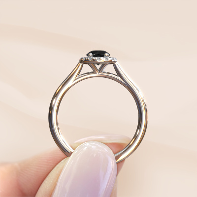 The ring shown above is called the Seline rnd 1. We call this type of ring a halo ring because it has one center gemstone and a band that is also pave set with gemstones. The platinum engagement ring is set with a round 0.60 crt black diamond center stone and the band is pave set with diamonds. What makes this classic platinum halo ring special are the smaller sized stones embracing the center stone. This gorgeous engagement ring is called a halo ring because the smaller gemstones give the center stone a halo of surrounding light. In order for the smaller stones to enhance the center stone, they have to be placed so there is no interference of light. And that's when our expert goldsmiths come in. Each individual stone is carefully set in the ring by hand. During manufacturing, light fall is constantly monitored to make sure the special halo is still visible. In the end you get a unique engagement ring, with a black diamond of your choosing at its centre. You can imagine the effect of a ring of such significance when you give it to her on her special day to shine. By using our modern techniques, we can design and customize the finest quality jewels with the utmost care for you. Our engagement rings are always priced 30 percent lower than other jewelers. We make engagement rings to order so we don't have to maintain a large stock. If you have a certain budget, we are more than happy to advice you accordingly.Different styles of new rings are made daily by our team. Perhaps you have found a halo engagement ring somewhere. One you would like to give to your loved one. Please feel free to share your thoughts and design with our jewel designers. We would love to turn your design into a classic engagement ring. You can follow the development of your ring design because we use very detailed 3D drawings. On top of that, you can order a dummy of the design. A dummy is a plastic ring, which can be shaped according your ring design. You can try it on and check if the engagement ring is up to standard. We will gladly send you a non-binding offer, based on a fair price/ quality ratio. The offer will baffle you, considering the quality of the ring and gemstones.To make it easier for you, we offer a 30 day return policy. Check our terms and conditions.