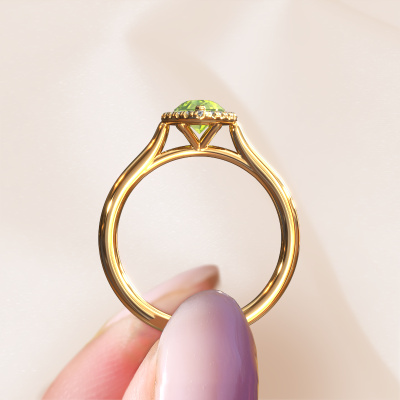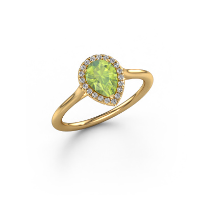 This 14 Carat gold ring is called Seline per 1 and is set with 7x5 mm peridot. This exclusive gold halo engagement ring is a true work of art! The ornaments are crafted with a lot of patience and great passion. In order to create this ring with great precision, this craft requires a keen eye and skillful hand. A challenge which ignites a fire in our expert goldsmith. The exquisite peridot are set in a special way so they stand out even more. This gives the ring an even more glamorous appearance. The charming engagement ring is actually unique on its own because of the gemstones which we carefully select especially for this ring. On top of that you select the precious metals which will be used to create a unique ring for the most extraordinary woman in your life! This jewel is made with passion and love by one of our master goldsmiths.After receiving your order, our goldsmiths will start the creative process of making your Seline per 1 engagement ring. We don't keep stock. This is advantageous because these costs will not be passed on to you. Therefore, we can offer jewelry at exceptionally low prices.Our team adds new designs to our online collection daily. Our designers and goldsmiths work together in creating the best design. We strive to offer a diverse collection of jewels. Perhaps you have a specific jewel design in mind. One you came across somewhere. Please contact us for a free consultation. We will make you an offer, based on a fair price/ quality ratio, that will baffle you.To make it easier for you, we offer a 30 day return policy. Check our terms and conditions.