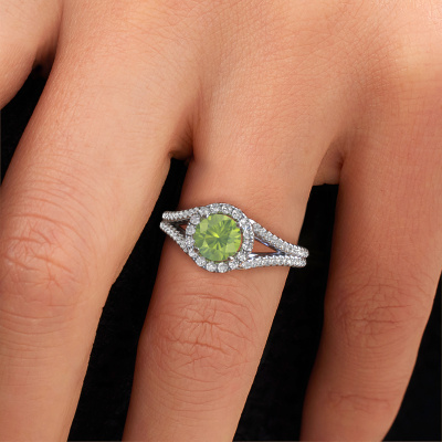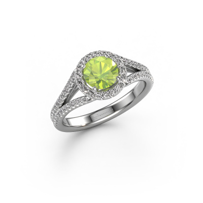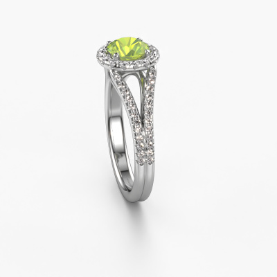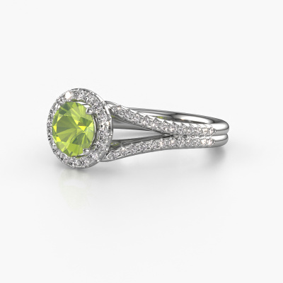 This platinum ring is called Verla rnd 2 and is set with 6.5 mm peridot. This exclusive platinum halo engagement ring is a true work of art! The ornaments are crafted with a lot of patience and great passion. In order to create this ring with great precision, this craft requires a keen eye and skillful hand. A challenge which ignites a fire in our expert goldsmith. The exquisite peridot are set in a special way so they stand out even more. This gives the ring an even more glamorous appearance. The split band engagement ring is actually unique on its own because of the gemstones which we carefully select especially for this ring. On top of that you select the precious metals which will be used to create a unique ring for the most extraordinary woman in your life! This jewel is made just for you, with attention to detail and design.Because we design and deliver our own rings, we can offer you a engagement ring at a price you won't find anywhere else. A ring is made to order, which helps prevent excess supplies, so we can make you a great price offer. We understand it feels risky, buying your engagement ring online, but we will gladly assist in the designing process, taking your budget into consideration.Our team adds new designs to our online collection daily. Our designers and goldsmiths work together in creating the best design. We strive to offer a diverse collection of jewels. Perhaps you have a specific jewel design in mind. One you came across somewhere. Please contact us for a free consultation. We will make you an offer, based on a fair price/ quality ratio, that will baffle you.To make it easier for you, we offer a 30 day return policy. Check our terms and conditions.