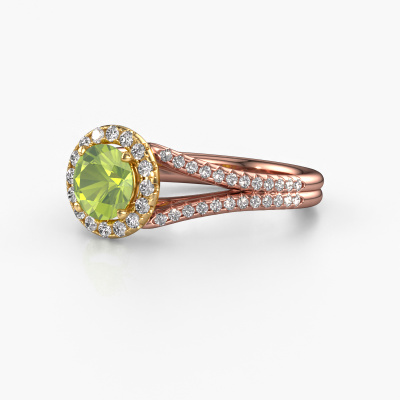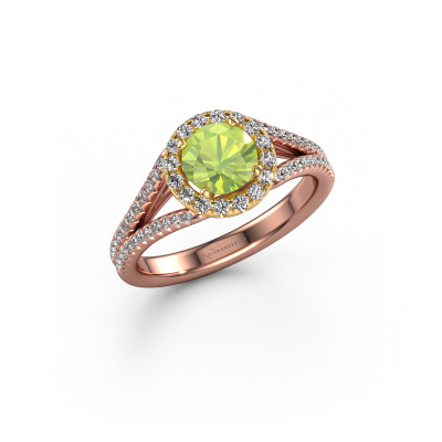 This 14 Carat rose gold ring is called Verla rnd 2 and is set with 6.5 mm peridot. This exclusive rose gold halo engagement ring is a true work of art! The ornaments are crafted with a lot of patience and great passion. In order to create this ring with great precision, this craft requires a keen eye and skillful hand. A challenge which ignites a fire in our expert goldsmith. The exquisite peridot are set in a special way so they stand out even more. This gives the ring an even more glamorous appearance. The split band engagement ring is actually unique on its own because of the gemstones which we carefully select especially for this ring. On top of that you select the precious metals which will be used to create a unique ring for the most extraordinary woman in your life! This jewel is made just for you, with attention to detail and design.Because we design and deliver our own rings, we can offer you a engagement ring at a price you won't find anywhere else. A ring is made to order, which helps prevent excess supplies, so we can make you a great price offer. We understand it feels risky, buying your engagement ring online, but we will gladly assist in the designing process, taking your budget into consideration.Our team adds new designs to our online collection daily. Our designers and goldsmiths work together in creating the best design. We strive to offer a diverse collection of jewels. Perhaps you have a specific jewel design in mind. One you came across somewhere. Please contact us for a free consultation. We will make you an offer, based on a fair price/ quality ratio, that will baffle you.To make it easier for you, we offer a 30 day return policy. Check our terms and conditions.