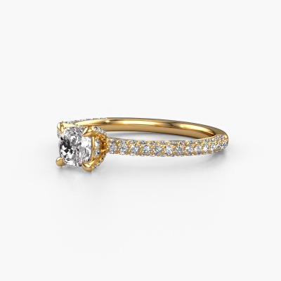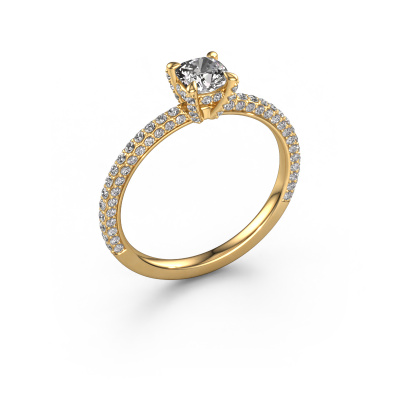 The ring shown above is called the Saskia 2 cus. We call this type of ring a pavé solitaire ring because it has one center gemstone and a band that is also pave set with gemstones. The 14 Carat gold engagement ring is set with a cushion 0.50 crt lab-grown diamond center stone and the band is pave set with lab-grown diamond gemstones. Each jewel is made just for you, with attention to detail and design.This contemporary gold pavé solitaire engagement ring has an exquisite cushion lab-grown diamond center stone. To further accentuate the center stone, the band is fully set with more lab grown diamonds. Its open prong setting allows light to strike the lab-grown diamond from various angles and this adds sparkle to your lab-grown diamond ring. The photo shown above depicts the goldsmith's carefully handcrafted details of the ring. The high positioning of the center stone is truly eye-catching. The perfect engagement ring for the crown jewel of your life! Are you on a budget? Please feel free to contact us, so we can go discuss your options. We offer our engagement rings at guaranteed best price, because we make them to order. You won't find such a price anywhere else!Our designers and goldsmiths work together each day, creating new jewels. Perhaps you have found a nice contemporary engagement ring somewhere, which can be used to customize your unique ring. Please feel free to contact us. We will make you an offer, based on a fair price/ quality ratio, which will amaze you.To make it easier for you, we offer a 30 day return policy. Check our terms and conditions.
