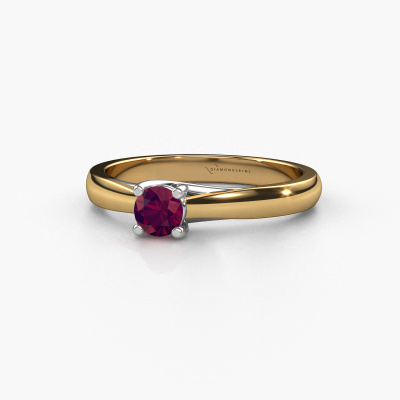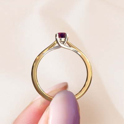 The ring shown above is called the Mia 1. We call this a solitaire ring because it contains a single gemstone. The engagement ring is made in 14 Carat gold and has a round rhodolite of 4 mm. This extraordinary modern gold solitaire engagement ring is set with a beautiful round rhodolite to add sparkle to your proposal. The open prong setting allows light to strike the gemstone from various angles. Did you know a diamond represents everlasting love and fidelity? This makes it a perfect centerpiece. Our goldsmith carefully positions the gemstone of your choosing high on top of the ring, which makes it stand out. Each piece of jewelry is made just for you by our master goldsmiths in our own studio.By using our modern techniques, we can design and customize the finest quality jewels with the utmost care for you. Our engagement rings are always priced 30 percent lower than other jewelers. We make engagement rings to order so we don't have to maintain a large stock. If you have a certain budget, we are more than happy to advice you accordingly.Our designers and goldsmiths work together each day, creating new jewels. Perhaps you have found a nice modern engagement ring somewhere, which can be used to customize your unique ring. Please feel free to contact us. We will make you an offer, based on a fair price/ quality ratio, which will amaze you.To make it easier for you, we offer a 30 day return policy. Check our terms and conditions.