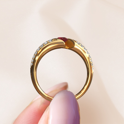 The ring shown above is called Hojalien 3. We call this a pave ring. The smaller gemstones of pave ring are set in a close row which gives it an extra shine. This 14 Carat gold ring is set with ruby 4.2 mm. The ring shown above is called Hojalien 3. We call this a pave ring. The smaller gemstones of pave ring are set in a close row which gives it an extra shine. Which emotion would you like to convey when you get down on one knee for her? This gold engagement ring is pave set with stunning ruby to represent your everlasting love. The gemstones are carefully hand selected and set by our goldsmith. The unique reflection of light on the ring can only be captured if the ruby are set in a perfect line. During the crafting and polishing of the jewelry, light fall is constantly monitored, until the expert goldsmith is satisfied with the result. A ring designed just for you to make your loved one shine bright like a diamond. Because there is only one special person fit to wear such a unique ring! With this meaningful piece of art, the symbol of infinity, you will prove your undying love for her and that you want to share the rest of your life with no one else. How will she be able to resist? This piece of jewelry is made to shine bright around your finger. Each jewel is hand made with love by our goldsmiths.Are you on a budget? Please feel free to contact us, so we can go discuss your options. We offer our engagement rings at guaranteed best price, because we make them to order. You won't find such a price anywhere else!Our team adds new designs to our online collection daily. Our designers and goldsmiths work together in creating the best design. We strive to offer a diverse collection of jewels. Perhaps you have a specific jewel design in mind. One you came across somewhere. Please contact us for a free consultation. We will make you an offer, based on a fair price/ quality ratio, that will baffle you.To make it easier for you, we offer a 30 day return policy. Check our terms and conditions.