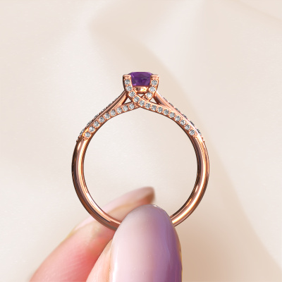 This 14 Carat rose gold ring is called Mia 3 and is set with 5 mm amethyst. This exclusive rose gold pavé solitaire engagement ring is a true work of art! The ornaments are crafted with a lot of patience and great passion. In order to create this ring with great precision, this craft requires a keen eye and skillful hand. A challenge which ignites a fire in our expert goldsmith. The exquisite amethysten are set in a special way so they stand out even more. This gives the ring an even more glamorous appearance. The shiny engagement ring is actually unique on its own because of the gemstones which we carefully select especially for this ring. On top of that you select the precious metals which will be used to create a unique ring for the most extraordinary woman in your life! This jewel is unique in every way! Simply customize to your likingAre you on a budget? Please feel free to contact us, so we can go discuss your options. We offer our engagement rings at guaranteed best price, because we make them to order. You won't find such a price anywhere else!Our team adds new designs to our online collection daily. Our designers and goldsmiths work together in creating the best design. We strive to offer a diverse collection of jewels. Perhaps you have a specific jewel design in mind. One you came across somewhere. Please contact us for a free consultation. We will make you an offer, based on a fair price/ quality ratio, that will baffle you.To make it easier for you, we offer a 30 day return policy. Check our terms and conditions.