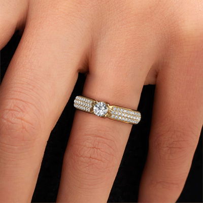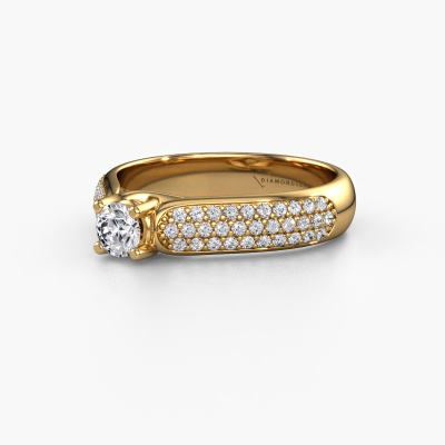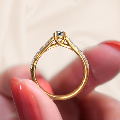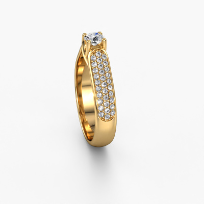 The ring shown above is called the Leoness. We call this type of ring a pavé solitaire ring. The center gemstone is surrounded by smaller sized stones. This 14 Carat gold version is set with a 0.25 crt round diamond center stone, embraced by smaller diamonds. What makes this classic gold pavé solitaire ring special is the setting of the smaller gems surrounding the center diamond, which are shaped like a beautiful flower. The surrounding pavé solitaire of stones frame the middle center stone in such a way to make it appear bigger. This type of engagement ring is also called a flower ring. It is very important that the smaller diamonds are positioned identically so there is no interference of light but perfect unity instead. Our skilled Goldsmiths get the job done. Each individual stone is carefully set by hand. During manufacturing, light fall is constantly monitored to make sure the special pavé solitaire effect is still visible. In the end you get the perfect engagement ring with a radiant diamond gemstone centerpiece. You can imagine the effect of a ring of such significance when you give tot the love of your life on her special day to shine. This jewel is unique in every way! Simply customize to your liking,By using our modern techniques, we can design and customize the finest quality jewels with the utmost care for you. Our engagement rings are always priced 30 percent lower than other jewelers. We make engagement rings to order so we don't have to maintain a large stock. If you have a certain budget, we are more than happy to advice you accordingly.Have you found a specific engagement ring somewhere which you would like to give to your loved one? Please feel free to express your wishes to our jewel designers because we would be honored to turn your design into a classic engagement ring. You can follow the development of your ring design because we use 3D drawings. This gives you a realistic preview of how your design will look. You can also preorder a dummy. A dummy is a plastic ring, which can be shaped according your ring design. You can try it on and check if its width and size are suitable for you. We will gladly send you a non-binding offer, based on a fair price/ quality ratio. It will amaze you, considering the quality of the ring and gemstones.To make it easier for you, we offer a 30 day return policy. Check our terms and conditions.