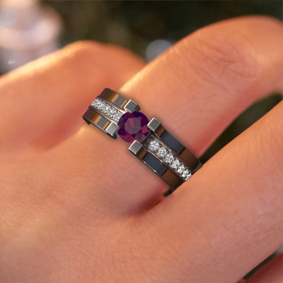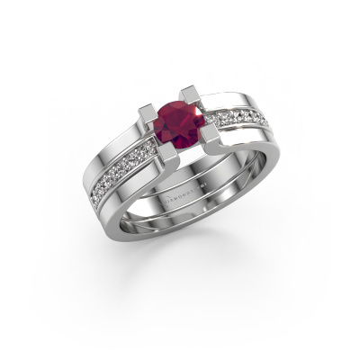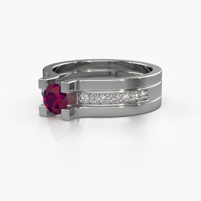 This platinum ring is called Myrthe and is set with 5 mm rhodolite. This exclusive platinum pavé solitaire engagement ring is a true work of art! The ornaments are crafted with a lot of patience and great passion. In order to create this ring with great precision, this craft requires a keen eye and skillful hand. A challenge which ignites a fire in our expert goldsmith. The exquisite rhodolite are set in a special way so they stand out even more. This gives the ring an even more glamorous appearance. The graceful engagement ring is actually unique on its own because of the gemstones which we carefully select especially for this ring. On top of that you select the precious metals which will be used to create a unique ring for the most extraordinary woman in your life! This jewel is made just for you, with attention to detail and design.After receiving your order, our goldsmiths will start the creative process of making your Myrthe engagement ring. We don't keep stock. This is advantageous because these costs will not be passed on to you. Therefore, we can offer jewelry at exceptionally low prices.Our designers and goldsmiths work together each day, creating new jewels. Perhaps you have found a nice modern engagement ring somewhere, which can be used to customize your unique ring. Please feel free to contact us. We will make you an offer, based on a fair price/ quality ratio, which will amaze you.To make it easier for you, we offer a 30 day return policy. Check our terms and conditions.