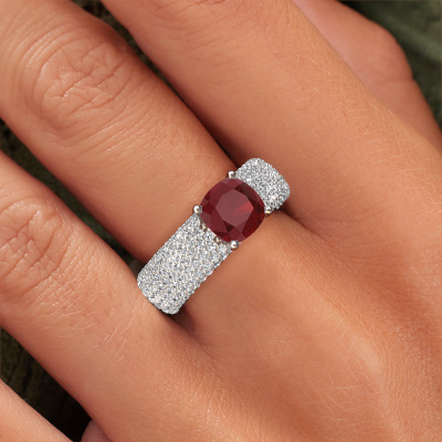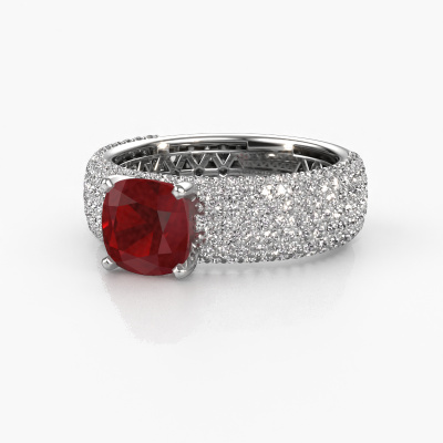 This platinum ring is called Darcy and is set with 7 mm ruby. This exclusive platinum pavé solitaire Engagement ring is a true work of art! The ornaments are crafted with a lot of patience and great passion. In order to create this ring with great precision, this craft requires a keen eye and skillful hand. A challenge which ignites a fire in our expert goldsmith. The exquisite ruby are set in a special way so they stand out even more. This gives the ring an even more glamorous appearance. The pavé Engagement ring is actually unique on its own because of the gemstones which we carefully select especially for this ring. On top of that you select the precious metals which will be used to create a unique ring for the most extraordinary woman in your life! This jewel is unique in every way! Simply customize to your likingBecause we design and deliver our own rings, we can offer you a Engagement ring at a price you won't find anywhere else. A ring is made to order, which helps prevent excess supplies, so we can make you a great price offer. We understand it feels risky, buying your Engagement ring online, but we will gladly assist in the designing process, taking your budget into consideration.Different styles of new rings are made daily by our team. Perhaps you have found a pavé solitaire Engagement ring somewhere. One you would like to give to your loved one. Please feel free to share your thoughts and design with our jewel designers. We would love to turn your design into a exclusive Engagement ring. You can follow the development of your ring design because we use very detailed 3D drawings. On top of that, you can order a dummy of the design. A dummy is a plastic ring, which can be shaped according your ring design. You can try it on and check if the Engagement ring is up to standard. We will gladly send you a non-binding offer, based on a fair price/ quality ratio. The offer will baffle you, considering the quality of the ring and gemstones.To make it easier for you, we offer a 30 day return policy. Check our terms and conditions.