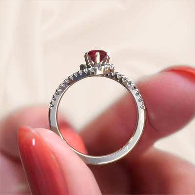 This platinum ring is called Elli and is set with 5 mm ruby. This exclusive platinum pavé solitaire engagement ring is a true work of art! The ornaments are crafted with a lot of patience and great passion. In order to create this ring with great precision, this craft requires a keen eye and skillful hand. A challenge which ignites a fire in our expert goldsmith. The exquisite ruby are set in a special way so they stand out even more. This gives the ring an even more glamorous appearance. The graceful engagement ring is actually unique on its own because of the gemstones which we carefully select especially for this ring. On top of that you select the precious metals which will be used to create a unique ring for the most extraordinary woman in your life! This jewel is made just for you, with attention to detail and design.After receiving your order, our goldsmiths will passionately start the creative process of making your engagement ring in our own studio. Because we don't have a big stockpile, these costs will not be passed on to you. Our pricing is proof of that! We offer top quality jewels at lowest price, guaranteed.Our designers and goldsmiths work together each day, creating new jewels. Perhaps you have found a nice exclusive engagement ring somewhere, which can be used to customize your unique ring. Please feel free to contact us. We will make you an offer, based on a fair price/ quality ratio, which will amaze you.To make it easier for you, we offer a 30 day return policy. Check our terms and conditions.