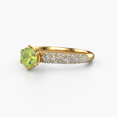 The ring shown above is called the Meryl. We call this type of ring a pavé solitaire ring because it has one center gemstone and a band that is also pave set with gemstones. This engagement ring is made in 14 Carat gold set with a 5.7 mm round peridot, and pave set diamonds at the sides. Each piece of jewelry is made just for you, with attention to detail and design.This exclusive gold pavé solitaire engagement ring has an exquisite round peridot center stone. To further accentuate the center stone, the band is set full with more diamonds. Its open prong setting allows light to strike the peridot from various angles and this adds sparkle to your peridot ring. The photo shown above depicts the goldsmith's carefully handcrafted details of the ring. The high positioning of the center stone is truly eye-catching. The perfect engagement ring for the crown jewel of your life!After receiving your order, our goldsmiths will passionately start the creative process of making your engagement ring in our own studio. Because we don't have a big stockpile, these costs will not be passed on to you. Our pricing is proof of that! We offer top quality jewels at lowest price, guaranteed.Have you found a specific engagement ring somewhere which you would like to give to your loved one? Please feel free to express your wishes to our jewel designers because we would be honored to turn your design into a exclusive engagement ring. You can follow the development of your ring design because we use 3D drawings. This gives you a realistic preview of how your design will look. You can also preorder a dummy. A dummy is a plastic ring, which can be shaped according your ring design. You can try it on and check if its width and size are suitable for you. We will gladly send you a non-binding offer, based on a fair price/ quality ratio. It will amaze you, considering the quality of the ring and gemstones.To make it easier for you, we offer a 30 day return policy. Check our terms and conditions.