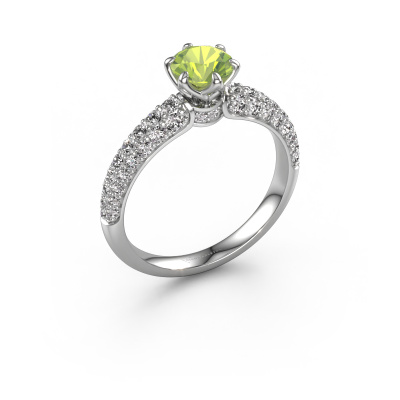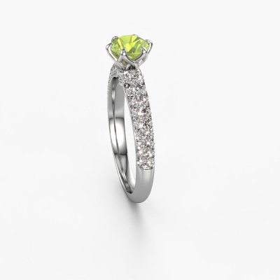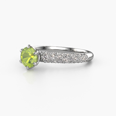The ring shown above is called the Meryl. We call this type of ring a pavé solitaire ring because it has one center gemstone and a band that is also pave set with gemstones. This engagement ring is made in 14 Carat white gold set with a 5.7 mm round peridot, and pave set diamonds at the sides. Each piece of jewelry is made just for you, with attention to detail and design.This exclusive white gold pavé solitaire engagement ring has an exquisite round peridot center stone. To further accentuate the center stone, the band is set full with more diamonds. Its open prong setting allows light to strike the peridot from various angles and this adds sparkle to your peridot ring. The photo shown above depicts the goldsmith's carefully handcrafted details of the ring. The high positioning of the center stone is truly eye-catching. The perfect engagement ring for the crown jewel of your life!After receiving your order, our goldsmiths will passionately start the creative process of making your engagement ring in our own studio. Because we don't have a big stockpile, these costs will not be passed on to you. Our pricing is proof of that! We offer top quality jewels at lowest price, guaranteed.Have you found a specific engagement ring somewhere which you would like to give to your loved one? Please feel free to express your wishes to our jewel designers because we would be honored to turn your design into a exclusive engagement ring. You can follow the development of your ring design because we use 3D drawings. This gives you a realistic preview of how your design will look. You can also preorder a dummy. A dummy is a plastic ring, which can be shaped according your ring design. You can try it on and check if its width and size are suitable for you. We will gladly send you a non-binding offer, based on a fair price/ quality ratio. It will amaze you, considering the quality of the ring and gemstones.To make it easier for you, we offer a 30 day return policy. Check our terms and conditions.