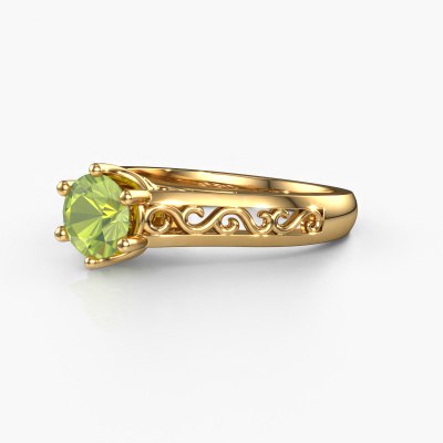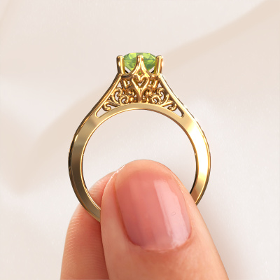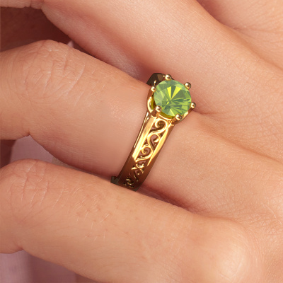 The ring shown above is called the Shan, we call this a solitaire ring because it contains a single gemstone. The engagement ring is made in 14 Carat gold and has a round peridot of 6 mm. The cool thing about our configurator is that you can compile your own piece of jewelry, into a completely personalized one. This solitaire ring is crafted in the precious metals gold with gold, but of course you are free to pick your own colors. Each piece of jewelry is made by a team of passionate goldsmiths and jewel designers. This will make your crown jewel truly eye-catching.The solitaire ring is a special type of engagement ring. Its open prong setting allows light to strike the gemstone from various angles. This Celtic engagement ring is a stunning eye-catcher because of the high positioning of the gemstone. In order for you to commemorate your proposal with a unique ring, we carefully adorn this solitaire ring by hand. The love of your life deserves nothing but the best. By using our modern techniques, we can design and customize the finest quality jewels with the utmost care for you. Our engagement rings are always priced 30 percent lower than other jewelers. We make engagement rings to order so we don't have to maintain a large stock. If you have a certain budget, we are more than happy to advice you accordingly.Have you found a specific engagement ring somewhere which you would like to give to your loved one? Please feel free to express your wishes to our jewel designers because we would be honored to turn your design into a Celtic engagement ring. You can follow the development of your ring design because we use 3D drawings. This gives you a realistic preview of how your design will look. You can also preorder a dummy. A dummy is a plastic ring, which can be shaped according your ring design. You can try it on and check if its width and size are suitable for you. We will gladly send you a non-binding offer, based on a fair price/ quality ratio. It will amaze you, considering the quality of the ring and gemstones.To make it easier for you, we offer a 30 day return policy. Check our terms and conditions.