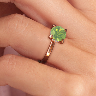In your eyes, no one else compares to her. She is one in a million, unlike anyone else and pure? These qualities are emphasized perfectly by our exclusive rose gold solitaire peridot ring. This peridot is carefully selected by our keen artisan goldsmiths. It equals the unique qualities of the love of your life. There is no better way to memorialize your proposal than this symbol of true love. The ring shown above is called the Simone RND 2, we call this a solitaire ring because it contains a single gemstone. The engagement ring is made in 14 Carat rose gold and has a round peridot of 7.3 mm. Each piece of jewelry is unique in every way! Simply customize to your liking,After receiving your order, our goldsmiths will passionately start the creative process of making your engagement ring in our own studio. Because we don't have a big stockpile, these costs will not be passed on to you. Our pricing is proof of that! We offer top quality jewels at lowest price, guaranteed.Our team adds new designs to our online collection daily. Our designers and goldsmiths work together in creating the best design. We strive to offer a diverse collection of jewels. Perhaps you have a specific jewel design in mind. One you came across somewhere. Please contact us for a free consultation. We will make you an offer, based on a fair price/ quality ratio, that will baffle you.To make it easier for you, we offer a 30 day return policy. Check our terms and conditions.