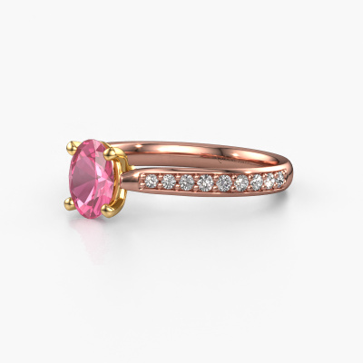 The ring shown above is called the Mignon ovl 2, we call this a solitaire ring because it contains a single gemstone. The engagement ring is made in 14 Carat rose gold and has a oval pink sapphire of 7x5 mm. The cool thing about our configurator is that you can compile your own piece of jewelry, into a completely personalized one. This solitaire ring is crafted in the precious metals rose gold with gold, but of course you are free to pick your own colors. Each piece of jewelry is made with passion and love by one of our master goldsmiths.The solitaire ring is a special type of engagement ring. Its open prong setting allows light to strike the gemstone from various angles. This chic engagement ring is a stunning eye-catcher because of the high positioning of the gemstone. In order for you to commemorate your proposal with a unique ring, we carefully adorn this solitaire ring by hand. The love of your life deserves nothing but the best. After receiving your order, our goldsmiths will passionately start the creative process of making your engagement ring in our own studio. Because we don't have a big stockpile, these costs will not be passed on to you. Our pricing is proof of that! We offer top quality jewels at lowest price, guaranteed.Our team adds new designs to our online collection daily. Our designers and goldsmiths work together in creating the best design. We strive to offer a diverse collection of jewels. Perhaps you have a specific jewel design in mind. One you came across somewhere. Please contact us for a free consultation. We will make you an offer, based on a fair price/ quality ratio, that will baffle you.To make it easier for you, we offer a 30 day return policy. Check our terms and conditions.