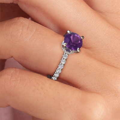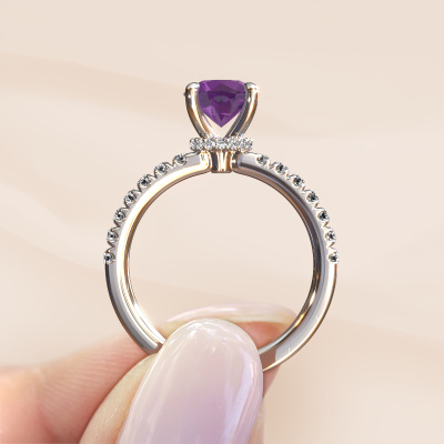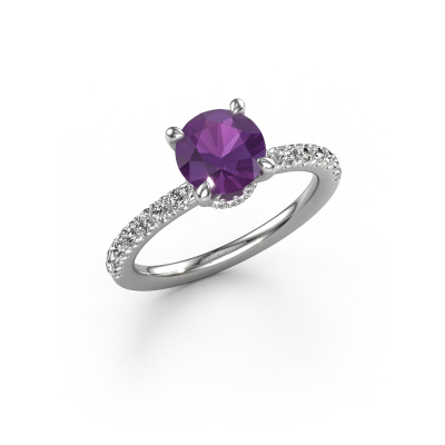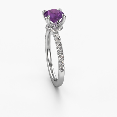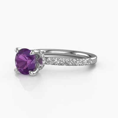 The ring shown above is called the Crystal rnd 4. We call this type of ring a pavé solitaire ring because it has one center gemstone and a band that is also pave set with gemstones. The platinum engagement ring is set with a round 7 mm amethyst center stone and the band is pave set with lab-grown diamond gemstones. Each jewel is made to shine bright around your finger. Each jewel is hand made with love by our goldsmiths.This fantasy platinum pavé solitaire engagement ring has an exquisite round amethyst center stone. To further accentuate the center stone, the band is fully set with more lab grown diamonds. Its open prong setting allows light to strike the amethyst from various angles and this adds sparkle to your amethyst ring. The photo shown above depicts the goldsmith's carefully handcrafted details of the ring. The high positioning of the center stone is truly eye-catching. The perfect engagement ring for the crown jewel of your life! By using our modern techniques, we can design and customize the finest quality jewels with the utmost care for you. Our engagement rings are always priced 30 percent lower than other jewelers. We make engagement rings to order so we don't have to maintain a large stock. If you have a certain budget, we are more than happy to advice you accordingly.Have you found a specific engagement ring somewhere which you would like to give to your loved one? Please feel free to express your wishes to our jewel designers because we would be honored to turn your design into a fantasy engagement ring. You can follow the development of your ring design because we use 3D drawings. This gives you a realistic preview of how your design will look. You can also preorder a dummy. A dummy is a plastic ring, which can be shaped according your ring design. You can try it on and check if its width and size are suitable for you. We will gladly send you a non-binding offer, based on a fair price/ quality ratio. It will amaze you, considering the quality of the ring and gemstones.To make it easier for you, we offer a 30 day return policy. Check our terms and conditions.