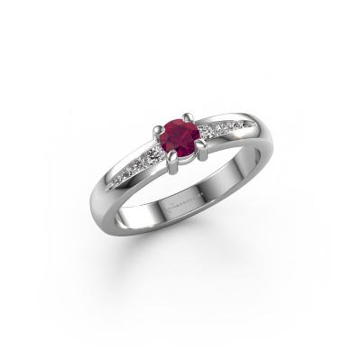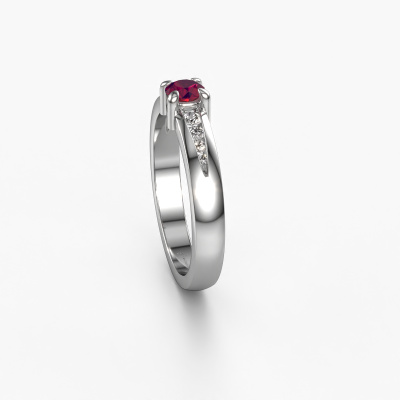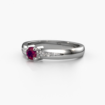 The ring shown above is called the Zohra. We call this type of ring a pavé solitaire ring because it has one center gemstone and a band that is also pave set with gemstones. The platinum engagement ring is set with a round 4 mm rhodolite center stone and the band is pave set with diamond gemstones. Each jewel is made just for you by our master goldsmiths in our own studio.This modern platinum pavé solitaire engagement ring has an exquisite round rhodolite center stone. To further accentuate the center stone, the band is fully set with more diamonds. Its open prong setting allows light to strike the rhodolite from various angles and this adds sparkle to your rhodolite ring. The photo shown above depicts the goldsmith's carefully handcrafted details of the ring. The high positioning of the center stone is truly eye-catching. The perfect engagement ring for the crown jewel of your life! Because we design and deliver our own rings, we can offer you a engagement ring at a price you won't find anywhere else. A ring is made to order, which helps prevent excess supplies, so we can make you a great price offer. We understand it feels risky, buying your engagement ring online, but we will gladly assist in the designing process, taking your budget into consideration.Our team adds new designs to our online collection daily. Our designers and goldsmiths work together in creating the best design. We strive to offer a diverse collection of jewels. Perhaps you have a specific jewel design in mind. One you came across somewhere. Please contact us for a free consultation. We will make you an offer, based on a fair price/ quality ratio, that will baffle you.To make it easier for you, we offer a 30 day return policy. Check our terms and conditions.