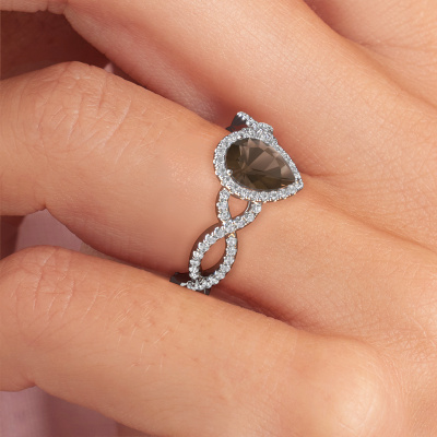 This platinum ring is called Dionne pear and is set with 7x5 mm smokey quartz. Does your girlfriend fancy exclusive jewelry? Or would you like to show her that she deserves the finest jewelry? This platinum ring is pure craftsmanship, love and passion combined with the latest techniques coming together in perfect harmony. It requires a keen eye, patience and a skillful hand to mold this ring into perfection. Just the job for our expert goldsmith! The smokey quartz set gemstones gives this platinum ring an extra glamorous appearance. Customize the style of the twist engagement ring to her liking with a wide variety of precious metals and gemstones which you select. That is how you create a unique ring for the most exclusive woman in your life! This jewel is created to add sparkle to your finger, each jewel is lovingly made by hand by our goldsmiths.Are you on a budget? Please feel free to contact us, so we can go discuss your options. We offer our engagement rings at guaranteed best price, because we make them to order. You won't find such a price anywhere else!Different styles of new rings are made daily by our team. Perhaps you have found a pavé solitaire engagement ring somewhere. One you would like to give to your loved one. Please feel free to share your thoughts and design with our jewel designers. We would love to turn your design into a exclusive engagement ring. You can follow the development of your ring design because we use very detailed 3D drawings. On top of that, you can order a dummy of the design. A dummy is a plastic ring, which can be shaped according your ring design. You can try it on and check if the engagement ring is up to standard. We will gladly send you a non-binding offer, based on a fair price/ quality ratio. The offer will baffle you, considering the quality of the ring and gemstones.To make it easier for you, we offer a 30 day return policy. Check our terms and conditions.