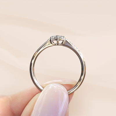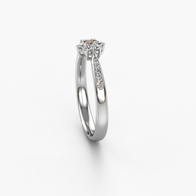 The ring shown above is called the Chantal 2. We call this type of ring a cluster ring, the center gemstone is surrounded by smaller sized stones. This platinum version is set with a 0.02 crt round brown diamond center stone, embraced by smaller lab grown diamonds. If you look at this platinum cluster engagement ring, you might get the impression that its smaller sized stones collide with the bigger brown diamond, so it is shaped like a flower. Therefore this engagement ring is also known as the flower ring. Our artisan goldsmiths get the job done. Each individual stone is carefully set by hand. During manufacturing, light fall is constantly monitored to make sure the special cluster effect is still visible. In the end you get the perfect engagement ring with a radiant brown diamond gemstone centerpiece. You can imagine the effect of a ring of such significance when you give tot the love of your life on her special day to shine. After receiving your order, our goldsmiths will passionately start the creative process of making your engagement ring in our own studio. Because we don't have a big stockpile, these costs will not be passed on to you. Our pricing is proof of that! We offer top quality jewels at lowest price, guaranteed.Have you found a specific engagement ring somewhere which you would like to give to your loved one? Please feel free to express your wishes to our jewel designers because we would be honored to turn your design into a traditional engagement ring. You can follow the development of your ring design because we use 3D drawings. This gives you a realistic preview of how your design will look. You can also preorder a dummy. A dummy is a plastic ring, which can be shaped according your ring design. You can try it on and check if its width and size are suitable for you. We will gladly send you a non-binding offer, based on a fair price/ quality ratio. It will amaze you, considering the quality of the ring and gemstones.To make it easier for you, we offer a 30 day return policy. Check our terms and conditions.