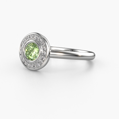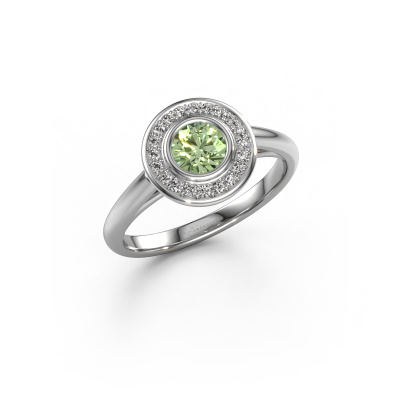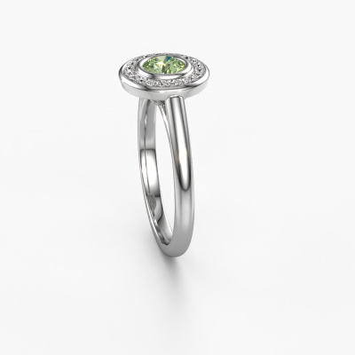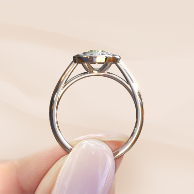 The ring shown above is called the Noud 1 RND. We call this type of ring a halo ring because it has one center gemstone and a band that is also pave set with gemstones. The platinum promise ring is set with a round 4.7 mm green lab grown diamond center stone and the band is pave set with diamonds. What makes this traditional platinum halo ring special are the smaller sized stones embracing the center stone. This gorgeous promise ring is called a halo ring because the smaller gemstones give the center stone a halo of surrounding light. In order for the smaller stones to enhance the center stone, they have to be placed so there is no interference of light. And that's when our expert goldsmiths come in. Each individual stone is carefully set in the ring by hand. During manufacturing, light fall is constantly monitored to make sure the special halo is still visible. In the end you get a unique promise ring, with a green lab grown diamond of your choosing at its centre. You can imagine the effect of a ring of such significance when you give it to her on her special day to shine.