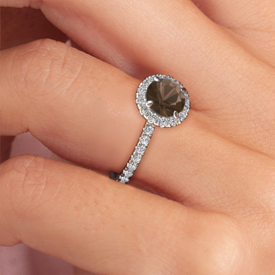 The ring shown above is called the Miranda rnd. We call this type of ring a halo ring because it has one center gemstone and a band that is also pave set with gemstones. The platinum engagement ring is set with a round 6.5 mm smokey quartz center stone and the band is pave set with lab grown diamonds. What makes this exclusive platinum halo ring special are the smaller sized stones embracing the center stone. This gorgeous engagement ring is called a halo ring because the smaller gemstones give the center stone a halo of surrounding light. In order for the smaller stones to enhance the center stone, they have to be placed so there is no interference of light. And that's when our expert goldsmiths come in. Each individual stone is carefully set in the ring by hand. During manufacturing, light fall is constantly monitored to make sure the special halo is still visible. In the end you get a unique engagement ring, with a smokey quartz of your choosing at its centre. You can imagine the effect of a ring of such significance when you give it to her on her special day to shine. By using our modern techniques, we can design and customize the finest quality jewels with the utmost care for you. Our engagement rings are always priced 30 percent lower than other jewelers. We make engagement rings to order so we don't have to maintain a large stock. If you have a certain budget, we are more than happy to advice you accordingly.Have you found a specific engagement ring somewhere which you would like to give to your loved one? Please feel free to express your wishes to our jewel designers because we would be honored to turn your design into a exclusive engagement ring. You can follow the development of your ring design because we use 3D drawings. This gives you a realistic preview of how your design will look. You can also preorder a dummy. A dummy is a plastic ring, which can be shaped according your ring design. You can try it on and check if its width and size are suitable for you. We will gladly send you a non-binding offer, based on a fair price/ quality ratio. It will amaze you, considering the quality of the ring and gemstones.To make it easier for you, we offer a 30 day return policy. Check our terms and conditions.