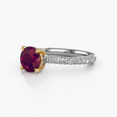 The ring shown above is called the Saskia rnd 2. We call this type of ring a pavé solitaire ring because it has one center gemstone and a band that is also pave set with gemstones. The 14 Carat white gold engagement ring is set with a round 7 mm rhodolite center stone and the band is pave set with lab-grown diamond gemstones. Each jewel is made by a team of passionate goldsmiths and jewel designers. This will make your crown jewel truly eye-catching.This exclusive white gold pavé solitaire engagement ring has an exquisite round rhodolite center stone. To further accentuate the center stone, the band is fully set with more lab grown diamonds. Its open prong setting allows light to strike the rhodolite from various angles and this adds sparkle to your rhodolite ring. The photo shown above depicts the goldsmith's carefully handcrafted details of the ring. The high positioning of the center stone is truly eye-catching. The perfect engagement ring for the crown jewel of your life! After receiving your order, our goldsmiths will passionately start the creative process of making your engagement ring in our own studio. Because we don't have a big stockpile, these costs will not be passed on to you. Our pricing is proof of that! We offer top quality jewels at lowest price, guaranteed.Our team adds new designs to our online collection daily. Our designers and goldsmiths work together in creating the best design. We strive to offer a diverse collection of jewels. Perhaps you have a specific jewel design in mind. One you came across somewhere. Please contact us for a free consultation. We will make you an offer, based on a fair price/ quality ratio, that will baffle you.To make it easier for you, we offer a 30 day return policy. Check our terms and conditions.