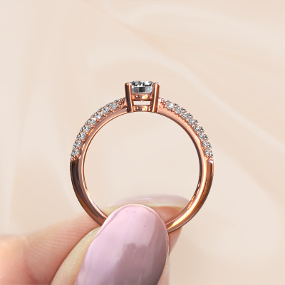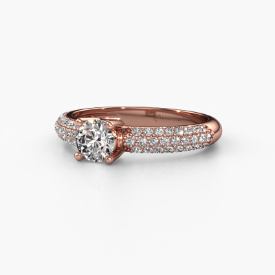 The ring shown above is called Marjan. We call this a pave ring. The smaller gemstones of pave ring are set in a close row which gives it an extra shine. This 14 Carat rose gold ring is set with diamonds 0.869 crt. The ring shown above is called Marjan. We call this a pave ring. The smaller gemstones of pave ring are set in a close row which gives it an extra shine. Which emotion would you like to convey when you get down on one knee for her? This rose gold engagement ring is pave set with stunning diamonds to represent your everlasting love. The gemstones are carefully hand selected and set by our goldsmith. The unique reflection of light on the ring can only be captured if the diamonds are set in a perfect line. During the crafting and polishing of the jewelry, light fall is constantly monitored, until the expert goldsmith is satisfied with the result. A ring designed just for you to make your loved one shine bright like a diamond. Because there is only one special person fit to wear such a unique ring! With this meaningful piece of art, the symbol of infinity, you will prove your undying love for her and that you want to share the rest of your life with no one else. How will she be able to resist? This piece of jewelry is made just for you, with attention to detail and design.By using our modern techniques, we can design and customize the finest quality jewels with the utmost care for you. Our engagement rings are always priced 30 percent lower than other jewelers. We make engagement rings to order so we don't have to maintain a large stock. If you have a certain budget, we are more than happy to advice you accordingly.Have you found a specific engagement ring somewhere which you would like to give to your loved one? Please feel free to express your wishes to our jewel designers because we would be honored to turn your design into a exclusive engagement ring. You can follow the development of your ring design because we use 3D drawings. This gives you a realistic preview of how your design will look. You can also preorder a dummy. A dummy is a plastic ring, which can be shaped according your ring design. You can try it on and check if its width and size are suitable for you. We will gladly send you a non-binding offer, based on a fair price/ quality ratio. It will amaze you, considering the quality of the ring and gemstones.To make it easier for you, we offer a 30 day return policy. Check our terms and conditions.