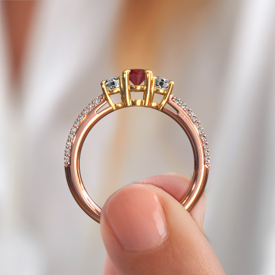 This 14 Carat rose gold ring is called Marielle OVL and is set with 6.5x4.5 mm ruby. Does your girlfriend fancy exclusive jewelry? Or would you like to show her that she deserves the finest jewelry? This rose gold ring is pure craftsmanship, love and passion combined with the latest techniques coming together in perfect harmony. It requires a keen eye, patience and a skillful hand to mold this ring into perfection. Just the job for our expert goldsmith! The ruby set gemstones gives this rose gold ring an extra glamorous appearance. Customize the style of the pavé engagement ring to her liking with a wide variety of precious metals and gemstones which you select. That is how you create a unique ring for the most exclusive woman in your life! This jewel is made just for you by our master goldsmiths in our own studio.Are you on a budget? Please feel free to contact us, so we can go discuss your options. We offer our engagement rings at guaranteed best price, because we make them to order. You won't find such a price anywhere else!Have you found a specific engagement ring somewhere which you would like to give to your loved one? Please feel free to express your wishes to our jewel designers because we would be honored to turn your design into a exclusive engagement ring. You can follow the development of your ring design because we use 3D drawings. This gives you a realistic preview of how your design will look. You can also preorder a dummy. A dummy is a plastic ring, which can be shaped according your ring design. You can try it on and check if its width and size are suitable for you. We will gladly send you a non-binding offer, based on a fair price/ quality ratio. It will amaze you, considering the quality of the ring and gemstones.To make it easier for you, we offer a 30 day return policy. Check our terms and conditions.