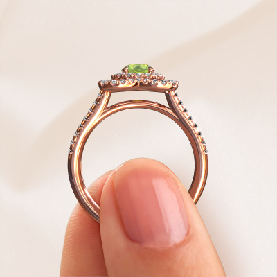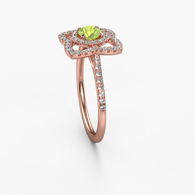 This 14 Carat rose gold ring is called Cleopatra and is set with peridot. An extraordinary rose gold vintage ring. One that will surely make the love of your life shine like a diamond! That is what we hope to achieve. This vintage engagement ring is set with exquisite peridot. Whichever gemstone you choose from our selection, is up to you. The gemstone is selected with great care because we believe your engagement ring must be adorned with nothing but the most beautiful gemstone. Wouldn't you agree? Our expert goldsmith will design your ring in our own artisan studio, where the peridot will be set with great precision. The ring will then be polished till it is absolutely perfect. Nothing but the best for the love of your life! This jewel is made just for you, with attention to detail and design.After receiving your order, our goldsmiths will passionately start the creative process of making your engagement ring in our own studio. Because we don't have a big stockpile, these costs will not be passed on to you. Our pricing is proof of that! We offer top quality jewels at lowest price, guaranteed.Have you found a specific engagement ring somewhere which you would like to give to your loved one? Please feel free to express your wishes to our jewel designers because we would be honored to turn your design into a vintage engagement ring. You can follow the development of your ring design because we use 3D drawings. This gives you a realistic preview of how your design will look. You can also preorder a dummy. A dummy is a plastic ring, which can be shaped according your ring design. You can try it on and check if its width and size are suitable for you. We will gladly send you a non-binding offer, based on a fair price/ quality ratio. It will amaze you, considering the quality of the ring and gemstones.To make it easier for you, we offer a 30 day return policy. Check our terms and conditions.