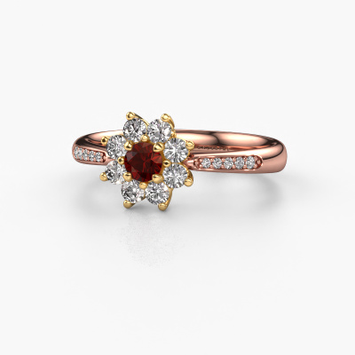 The ring shown above is called the Camille 2. We call this type of ring a cluster ring, the center gemstone is surrounded by smaller sized stones. This 14 Carat rose gold version is set with a 3.4 mm round garnet center stone, embraced by smaller diamonds. If you look at this rose gold cluster engagement ring, you might get the impression that its smaller sized stones collide with the bigger garnet, so it is shaped like a flower. Therefore this engagement ring is also known as the flower ring. Our artisan goldsmiths get the job done. Each individual stone is carefully set by hand. During manufacturing, light fall is constantly monitored to make sure the special cluster effect is still visible. In the end you get the perfect engagement ring with a radiant garnet gemstone centerpiece. You can imagine the effect of a ring of such significance when you give tot the love of your life on her special day to shine. Because we design and deliver our own rings, we can offer you a engagement ring at a price you won't find anywhere else. A ring is made to order, which helps prevent excess supplies, so we can make you a great price offer. We understand it feels risky, buying your engagement ring online, but we will gladly assist in the designing process, taking your budget into consideration.Our team adds new designs to our online collection daily. Our designers and goldsmiths work together in creating the best design. We strive to offer a diverse collection of jewels. Perhaps you have a specific jewel design in mind. One you came across somewhere. Please contact us for a free consultation. We will make you an offer, based on a fair price/ quality ratio, that will baffle you.To make it easier for you, we offer a 30 day return policy. Check our terms and conditions.