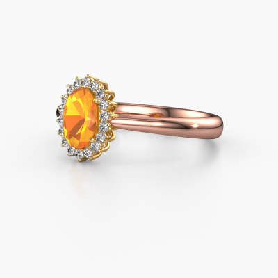 The ring shown above is called the Tilly ovl 1. We call this type of ring a cluster ring, the center gemstone is surrounded by smaller sized stones. This 14 Carat rose gold version is set with a 7x5 mm oval citrin center stone, embraced by smaller lab grown diamonds. The classic rose gold cluster engagement ring stands out because of its shape. Together, the smaller and bigger sized citrin gemstones form a flower and they appear to collide into one big sparkling gem. This classic engagement ring is also known as the flower ring. Our expert Goldsmiths make sure the smaller lab grown diamonds stones are set identically so there is no light interference in the citrin but unity instead. With perfect precision and a skillful hand each citrin is set in the ring. During manufacturing, it is constantly monitored to make sure light reflects flawlessly. This results in a unique engagement ring, with a radiant citrin at its centre. A lovely, meaningful gift to bestow upon the love of your life. By using a combination of the latest modern techniques, combined with ancient crafting, we can make all our engagement rings in our own studio. Each jewel is made to order. This is advantageous because we can offer you a price you won't find anywhere else.Do you have a specific ring in mind? One you came across somewhere. Please feel free to tell us your wishes and we will turn your design into a unique engagement ring. You can follow the development of your ring design because we use 3D drawings. This gives you a realistic preview of your design. We will gladly send you a non-binding offer, based on a fair price/ quality ratio. It will amaze you.To make it easier for you, we offer a 30 day return policy. Check our terms and conditions.