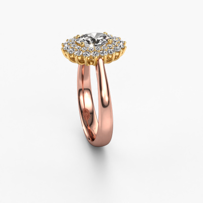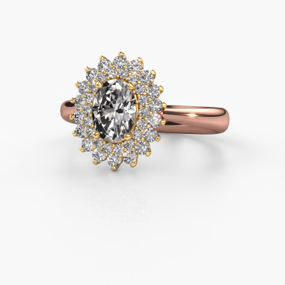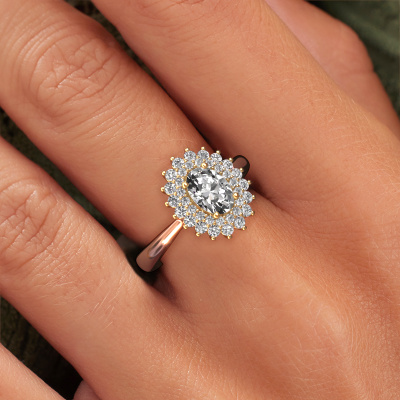 The ring shown above is called the Alina 1. We call this type of ring a cluster ring, the center gemstone is surrounded by smaller sized stones. This 14 Carat rose gold version is set with a 7x5 mm oval zirconia center stone, embraced by smaller diamonds. The classic rose gold cluster engagement ring stands out because of its shape. Together, the smaller and bigger sized zirconia gemstones form a flower and they appear to collide into one big sparkling gem. This classic engagement ring is also known as the flower ring. Our expert Goldsmiths make sure the smaller diamonds stones are set identically so there is no light interference in the zirconia but unity instead. With perfect precision and a skillful hand each zirconia is set in the ring. During manufacturing, it is constantly monitored to make sure light reflects flawlessly. This results in a unique engagement ring, with a radiant zirconia at its centre. A lovely, meaningful gift to bestow upon the love of your life. Are you on a budget? Please feel free to contact us, so we can go discuss your options. We offer our engagement rings at guaranteed best price, because we make them to order. You won't find such a price anywhere else!Our designers and goldsmiths work together each day, creating new jewels. Perhaps you have found a nice classic engagement ring somewhere, which can be used to customize your unique ring. Please feel free to contact us. We will make you an offer, based on a fair price/ quality ratio, which will amaze you.To make it easier for you, we offer a 30 day return policy. Check our terms and conditions.