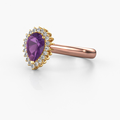 The ring shown above is called the Tilly per 1. We call this type of ring a cluster ring, the center gemstone is surrounded by smaller sized stones. This 14 Carat rose gold version is set with a 8x6 mm pear amethyst center stone, embraced by smaller diamonds. The exclusive rose gold cluster engagement ring stands out because of its shape. Together, the smaller and bigger sized amethyst gemstones form a flower and they appear to collide into one big sparkling gem. This exclusive engagement ring is also known as the flower ring. Our expert Goldsmiths make sure the smaller diamonds stones are set identically so there is no light interference in the amethyst but unity instead. With perfect precision and a skillful hand each amethyst is set in the ring. During manufacturing, it is constantly monitored to make sure light reflects flawlessly. This results in a unique engagement ring, with a radiant amethyst at its centre. A lovely, meaningful gift to bestow upon the love of your life. After receiving your order, our goldsmiths will start the creative process of making your Tilly per 1 engagement ring. We don't keep stock. This is advantageous because these costs will not be passed on to you. Therefore, we can offer jewelry at exceptionally low prices.Our team adds new designs to our online collection daily. Our designers and goldsmiths work together in creating the best design. We strive to offer a diverse collection of jewels. Perhaps you have a specific jewel design in mind. One you came across somewhere. Please contact us for a free consultation. We will make you an offer, based on a fair price/ quality ratio, that will baffle you.To make it easier for you, we offer a 30 day return policy. Check our terms and conditions.