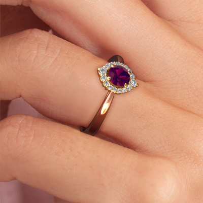 The ring shown above is called the Tora. We call this type of ring a cluster ring, the center gemstone is surrounded by smaller sized stones. This 14 Carat rose gold version is set with a 5 mm round rhodolite center stone, embraced by smaller lab grown diamonds. The classic rose gold cluster engagement ring stands out because of its shape. Together, the smaller and bigger sized rhodolite gemstones form a flower and they appear to collide into one big sparkling gem. This classic engagement ring is also known as the flower ring. Our expert Goldsmiths make sure the smaller lab grown diamonds stones are set identically so there is no light interference in the rhodolite but unity instead. With perfect precision and a skillful hand each rhodolite is set in the ring. During manufacturing, it is constantly monitored to make sure light reflects flawlessly. This results in a unique engagement ring, with a radiant rhodolite at its centre. A lovely, meaningful gift to bestow upon the love of your life. By using a combination of the latest modern techniques, combined with ancient crafting, we can make all our engagement rings in our own studio. Each jewel is made to order. This is advantageous because we can offer you a price you won't find anywhere else.Have you found a specific engagement ring somewhere which you would like to give to your loved one? Please feel free to express your wishes to our jewel designers because we would be honored to turn your design into a classic engagement ring. You can follow the development of your ring design because we use 3D drawings. This gives you a realistic preview of how your design will look. You can also preorder a dummy. A dummy is a plastic ring, which can be shaped according your ring design. You can try it on and check if its width and size are suitable for you. We will gladly send you a non-binding offer, based on a fair price/ quality ratio. It will amaze you, considering the quality of the ring and gemstones.To make it easier for you, we offer a 30 day return policy. Check our terms and conditions.