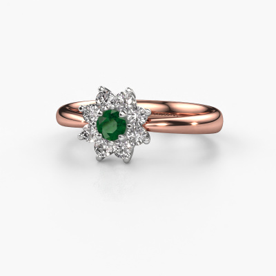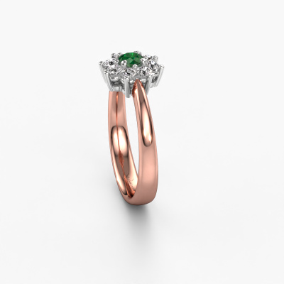 The ring shown above is called the Camille 1. We call this type of ring a cluster ring, the center gemstone is surrounded by smaller sized stones. This 14 Carat rose gold version is set with a 3.4 mm round emerald center stone, embraced by smaller diamonds. The traditional rose gold cluster engagement ring stands out because of its shape. Together, the smaller and bigger sized emerald gemstones form a flower and they appear to collide into one big sparkling gem. This traditional engagement ring is also known as the flower ring. Our expert Goldsmiths make sure the smaller diamonds stones are set identically so there is no light interference in the emerald but unity instead. With perfect precision and a skillful hand each emerald is set in the ring. During manufacturing, it is constantly monitored to make sure light reflects flawlessly. This results in a unique engagement ring, with a radiant emerald at its centre. A lovely, meaningful gift to bestow upon the love of your life. By using our modern techniques, we can design and customize the finest quality jewels with the utmost care for you. Our engagement rings are always priced 30 percent lower than other jewelers. We make engagement rings to order so we don't have to maintain a large stock. If you have a certain budget, we are more than happy to advice you accordingly.Our team adds new designs to our online collection daily. Our designers and goldsmiths work together in creating the best design. We strive to offer a diverse collection of jewels. Perhaps you have a specific jewel design in mind. One you came across somewhere. Please contact us for a free consultation. We will make you an offer, based on a fair price/ quality ratio, that will baffle you.To make it easier for you, we offer a 30 day return policy. Check our terms and conditions.