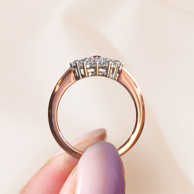 The ring shown above is called the Vickey. We call this type of ring a cluster ring, the center gemstone is surrounded by smaller sized stones. This 14 Carat rose gold version is set with a 2 mm round ruby center stone, embraced by smaller diamonds. The classic rose gold flower engagement ring stands out because of its shape. Together, the smaller and bigger sized ruby gemstones form a flower and they appear to collide into one big sparkling gem. This classic engagement ring is also known as the flower ring. Our expert Goldsmiths make sure the smaller diamonds stones are set identically so there is no light interference in the ruby but unity instead. With perfect precision and a skillful hand each ruby is set in the ring. During manufacturing, it is constantly monitored to make sure light reflects flawlessly. This results in a unique engagement ring, with a radiant ruby at its centre. A lovely, meaningful gift to bestow upon the love of your life. Because we design and deliver our own rings, we can offer you a engagement ring at a price you won't find anywhere else. A ring is made to order, which helps prevent excess supplies, so we can make you a great price offer. We understand it feels risky, buying your engagement ring online, but we will gladly assist in the designing process, taking your budget into consideration.Our designers and goldsmiths work together each day, creating new jewels. Perhaps you have found a nice classic engagement ring somewhere, which can be used to customize your unique ring. Please feel free to contact us. We will make you an offer, based on a fair price/ quality ratio, which will amaze you.To make it easier for you, we offer a 30 day return policy. Check our terms and conditions.